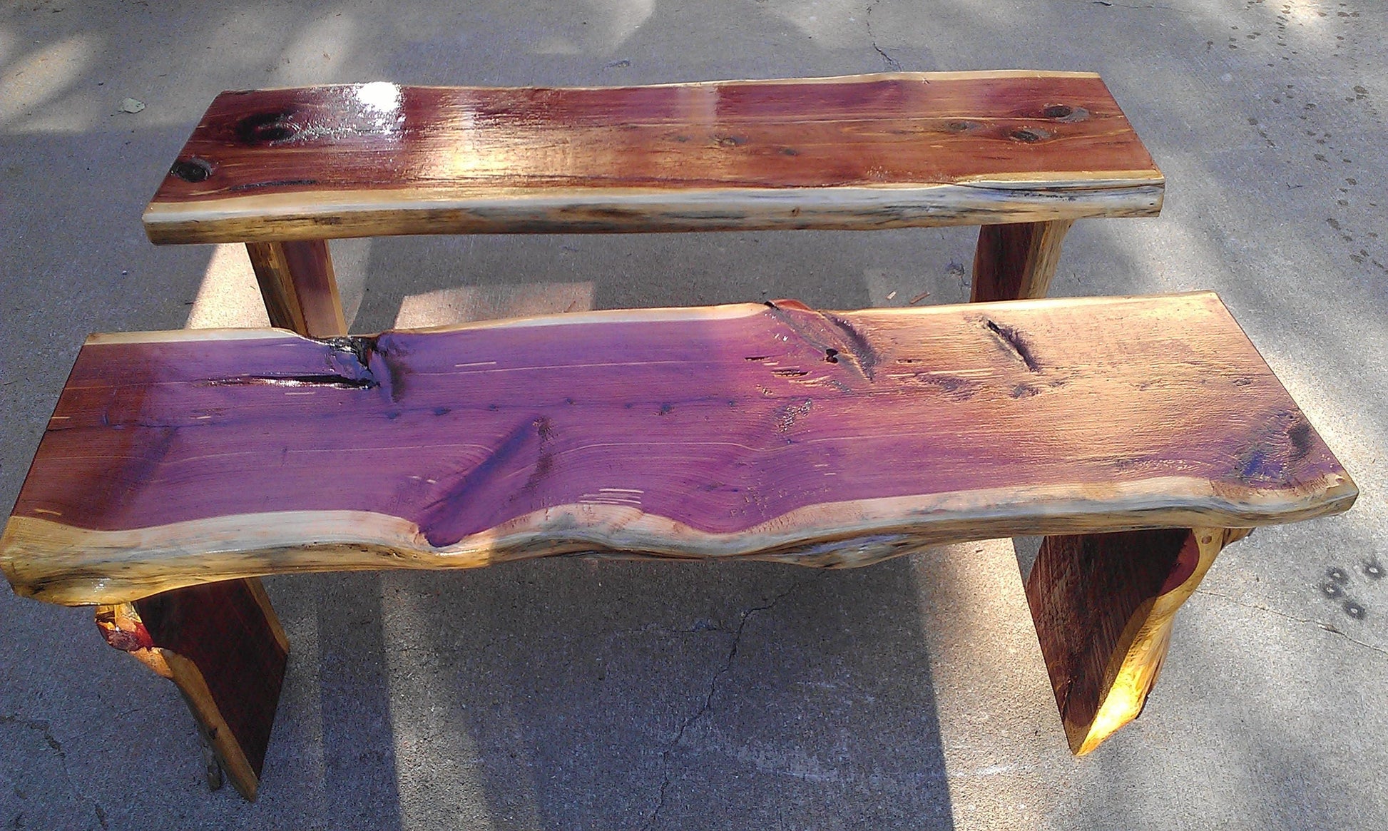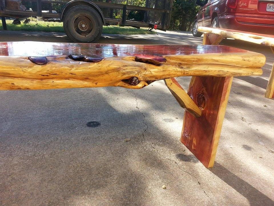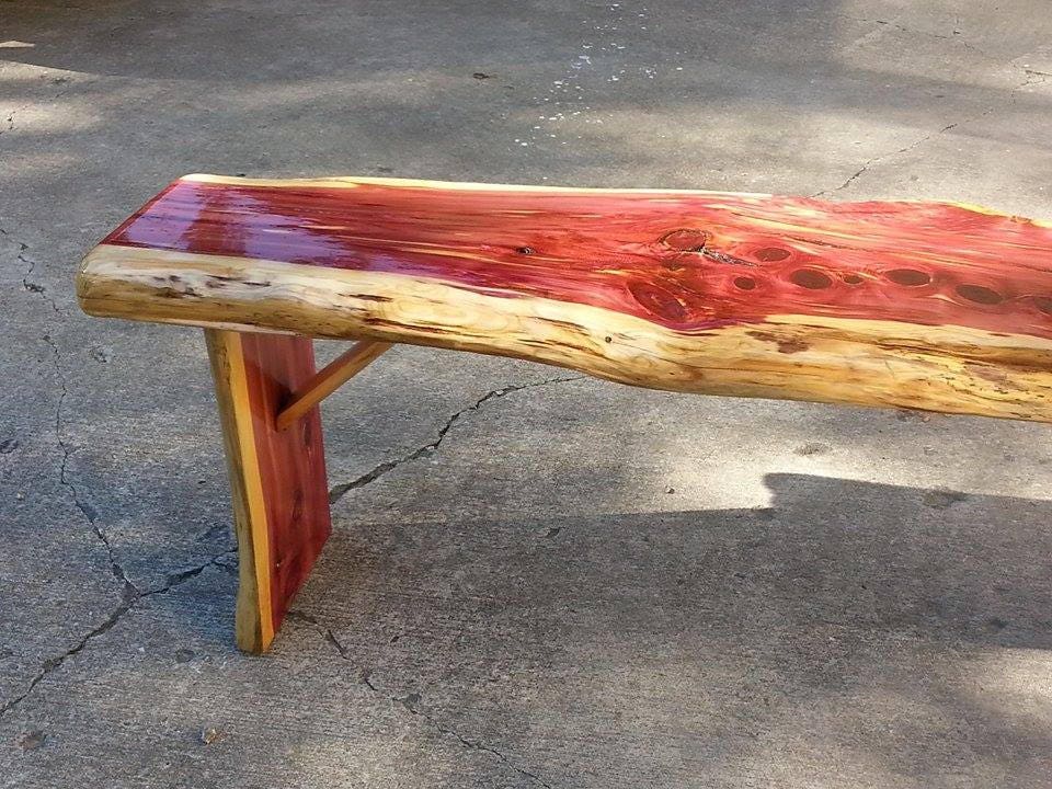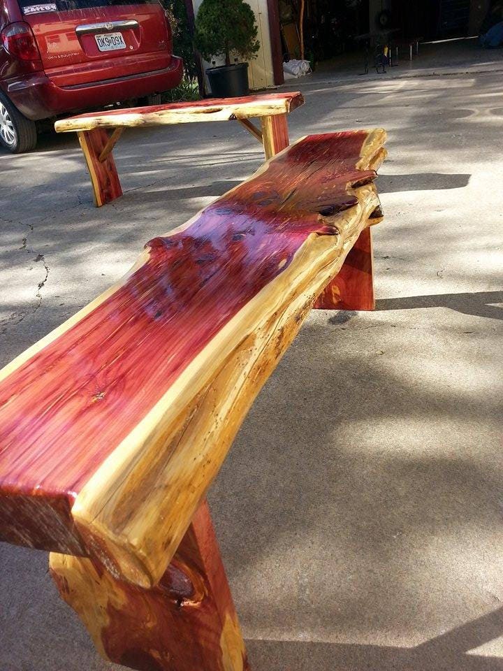 Hand Crafted Cedar Bench with the dual live edge is hand-crafted and made with locally harvested eastern red cedar. Our benches are created in three different sizes to meet your needs. We offer 3', 4', and 5' long benches that are perfect for indoor and outdoor gardens or on the front porch. One thing is guaranteed, no two benches will ever be alike. All our benches are custom designed, created, and made to order.